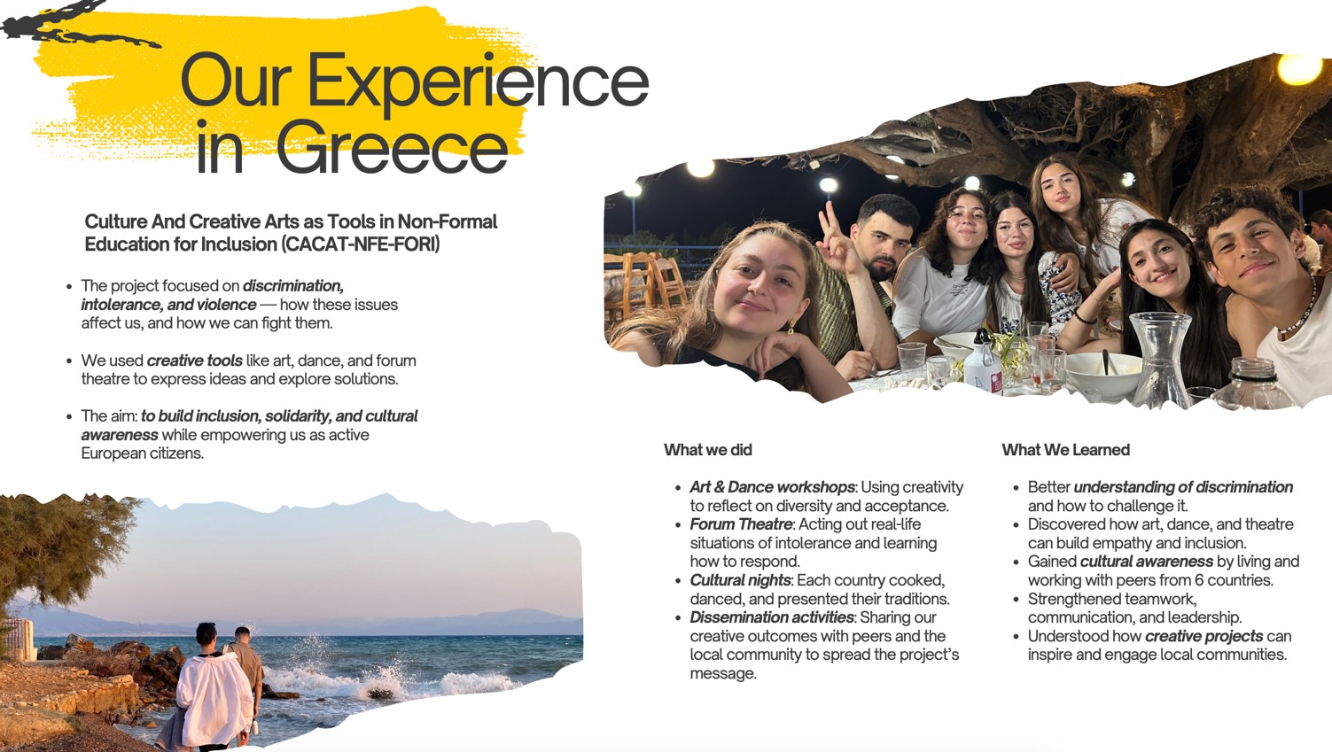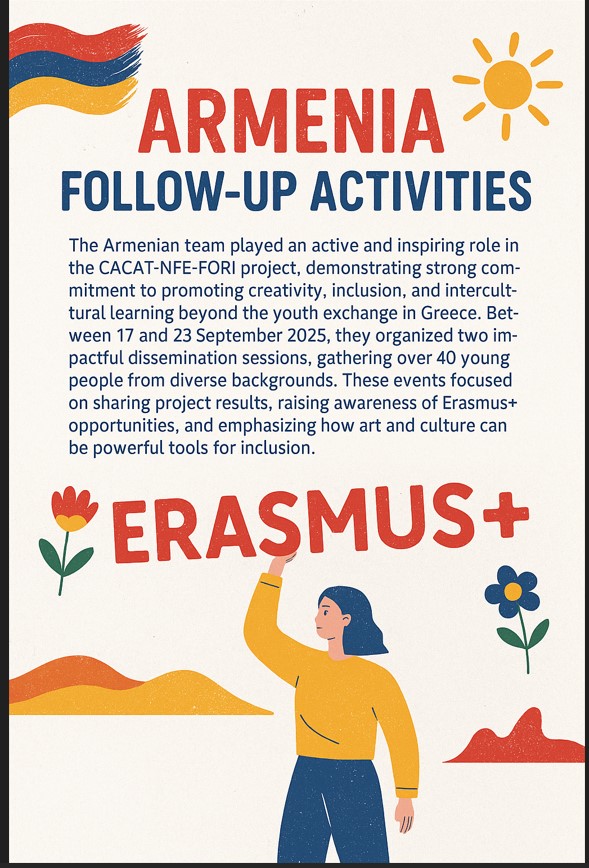 The Armenian team played an active and inspiring role in the CACAT-NFE-FORI project, demonstrating strong commitment to promoting creativity, inclusion, and intercultural learning beyond the youth exchange in Greece. Between 17 and 23 September 2025, they organized two impactful dissemination sessions in Armenia — one at the Alternative Youth Center and another at Gyumri Economic College. These sessions gathered over 40 young people from diverse backgrounds, focusing on sharing project results, raising awareness of Erasmus+ opportunities, and emphasizing how art and culture can be powerful tools for inclusion. Through interactive presentations, discussions, and visual showcases, the Armenian participants highlighted their learning experiences, teamwork, and cultural exchange from the project. Their dissemination work extended to social media, where members shared personal reflections, creative insights, and videos — amplifying the project's visibility and motivating others to join future Erasmus+ initiatives. Each participant, from Nare and Shushan to Van, Taron, Arman, Rosie, and Volodya, brought a unique voice and story, illustrating how non-formal education through arts can connect people across cultures. Their collective efforts created a lasting impact on local youth, inspiring them to embrace diversity, creativity, and European values in their own communities.