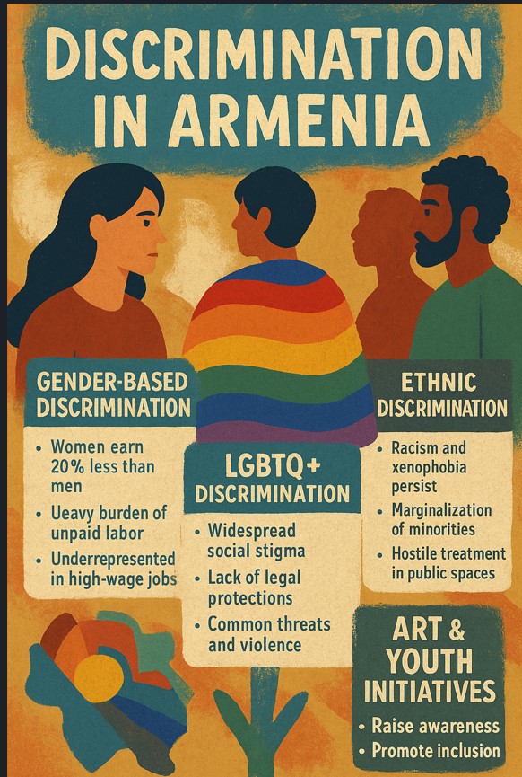 As part of the Erasmus+ Youth Exchange project CACAT – Culture and Creative Arts as Tools in Non-Formal Education for Inclusion, the Armenian team conducted a comprehensive national research on discrimination and inclusion in Armenia. Their work focuses on key issues related to gender inequality, LGBTQ+ rights, and ethnic discrimination, offering valuable insight into the country's social dynamics and structural challenges. The research highlights striking data, real-life cases, and the voices of marginalized individuals, while also showcasing the vital role of art and youth initiatives in raising awareness and promoting inclusion. By connecting local realities with the project's creative goals, the Armenian team lays the groundwork for meaningful intercultural dialogue and transformative non-formal education experiences.