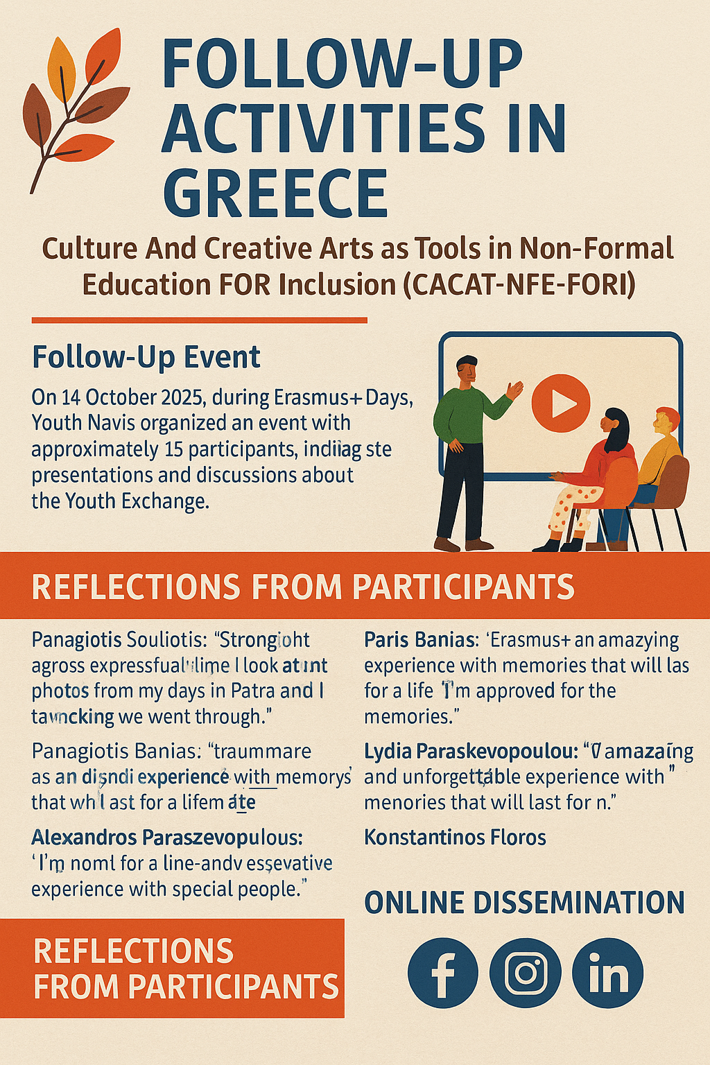 As the host country of the CACAT-NFE-FORI project, the Greek team—led by Youth Navis—continued to spread the message of inclusion, creativity, and intercultural learning well beyond the exchange in Kato Alissos. Their main follow-up event took place on 14 October 2025 during the Erasmus+ Days, where participants presented the project's outcomes, shared personal reflections, and discussed the transformative power of art in non-formal education. The event gathered around 15 attendees, including youth, educators, and community members, who actively engaged in discussions about inclusion, creativity, and European cooperation. Through interactive storytelling, visual presentations, and personal testimonies, the team highlighted how culture and creative arts can unite young people across borders.