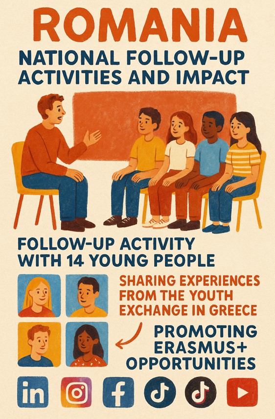 The Romanian team demonstrated exceptional commitment to spreading the values of inclusion, creativity, and European cooperation learned during the CACAT-NFE-FORI youth exchange in Greece. Their follow-up activity gathered 14 young participants aged 14–18, eager to learn more about Erasmus+ opportunities and the transformative experiences that come with them. During this interactive session, the team shared personal stories, discussed what they learned about non-formal education through arts, and answered practical questions about participation, communication, and overcoming language barriers. The Romanian youth showed great enthusiasm, with many expressing a strong desire to join future Erasmus+ projects. Team members like Bianca Tudose, Matei-Stan Stanciu, Vlad-Ștefan Gavril, Raluca Proca, Silviu-Ionuț Ștefanovici, Tudor-Călin Burca, and Cătălin Hilițanu actively promoted the project through creative posts, videos, and reflections on LinkedIn, Instagram, Facebook, TikTok, and YouTube, further inspiring peers across their networks. Their efforts not only showcased the power of art as a tool for inclusion but also helped strengthen a new generation of motivated young people ready to engage in intercultural learning and European cooperation.